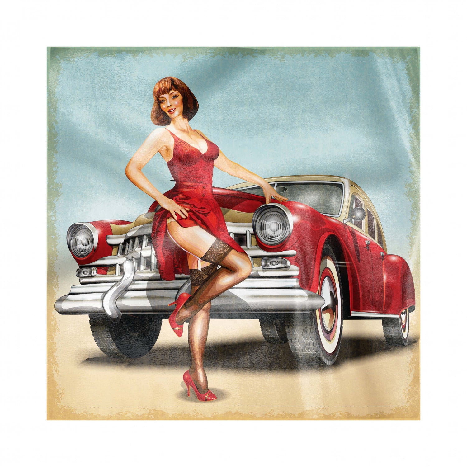 Pin Up Girl Decorative Satin Napkins Set Of 4 Short Dutch Haircut Style Brunette Lady Standing In Front Of A Brand New Car Square Fabric Party Dinner Napkin 12 Multicolor By